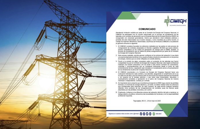El Colegio de Ingeniero Mecánicos, Electricistas y Químicos de Honduras (CIMEQH), señaló que considera favorable los esfuerzos realizados en el proceso de renegociación de contratos amparados en Decreto Legislativo 46-2022 que busca obtener precios competitivos en los costos de generación de energía.