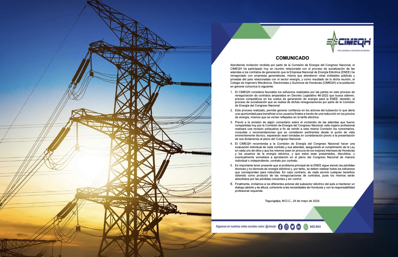 Para finalizar, el CIMEQH invita a los diferentes actores del subsector eléctrico del país a mantener un diálogo abierto y de altura, coherente a las necesidades de Honduras y con la responsabilidad profesional requerida