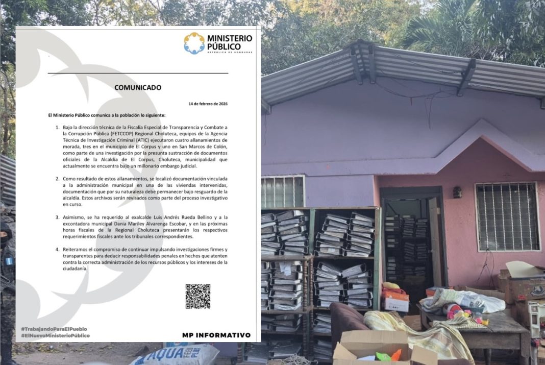 El Ministerio Público de Honduras informó que, bajo la coordinación de la Fiscalía Especial de Transparencia y Combate a la Corrupción Pública (FETCCOP) Regional Choluteca, equipos de la Agencia Técnica de Investigación Criminal (ATIC) ejecutaron cuatro allanamientos de morada, tres en el municipio de El Corpus y uno en San Marcos de Colón, en el marco de una investigación por la presunta sustracción de documentos oficiales de la Alcaldía de El Corpus.