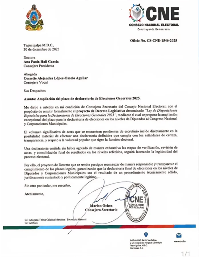 Por medio de una carta enviada a sus comañerfas en el órgano electoral, Ana Paola Hall y Cossette López, Ochoa propone el proyecto de decreto legislativo denominado, “Ley de Disposiciones Especiales para la Declaratoria de Elecciones Generales 2025”, con el cual se pretende ampliar el plazo de la declaratoria de elecciones en los niveles de diputados al Congreso Nacional (CN) y corporaciones municipales.