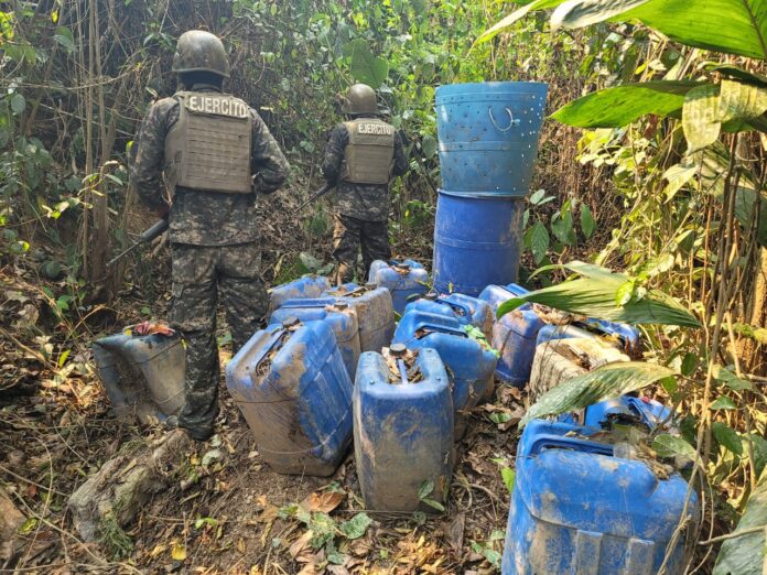 Igualmente, en el lugar se encontró una estructura de madera tipo narcolaboratorio, 10 libras de semilla supuesta cocaína, cinco barriles para almacenar combustible, cinco bidones de combustible, un saco de sulfato de amonio y un saco de fertilizante.