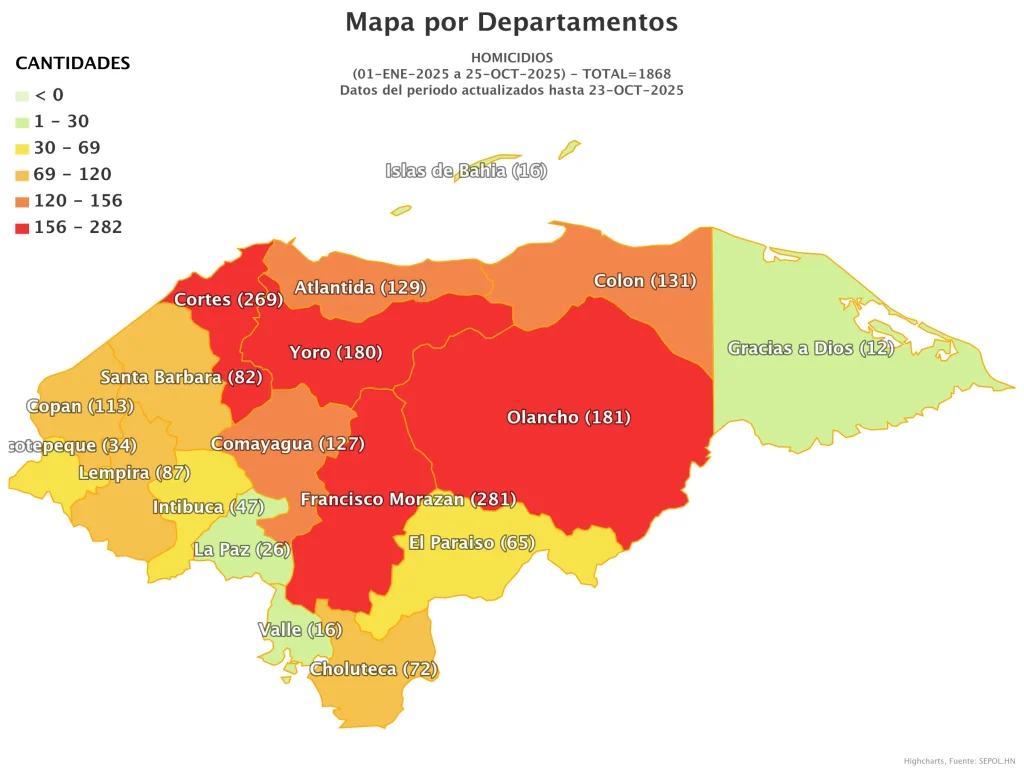 El asesinato del juez de Policía se suma a la alarmante cifra de homicidios que golpea a Honduras en 2025. Según datos del Sistema Estadístico Policial en Línea (Sepol), entre el 1 de enero y el 23 de octubre de este año se registran 1,868 homicidios a nivel nacional.