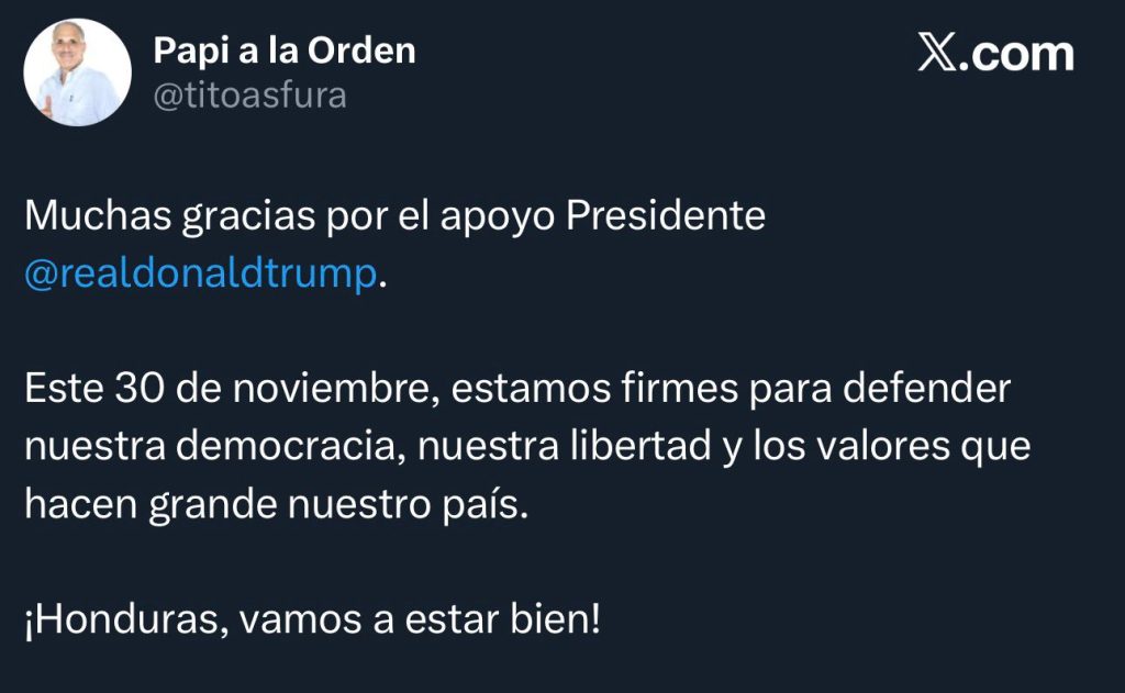 “Este 30 de noviembre, estamos firmes para defender nuestra democracia, nuestra libertad y los valores que hacen grande nuestro país. ¡Honduras, vamos a estar bien!”