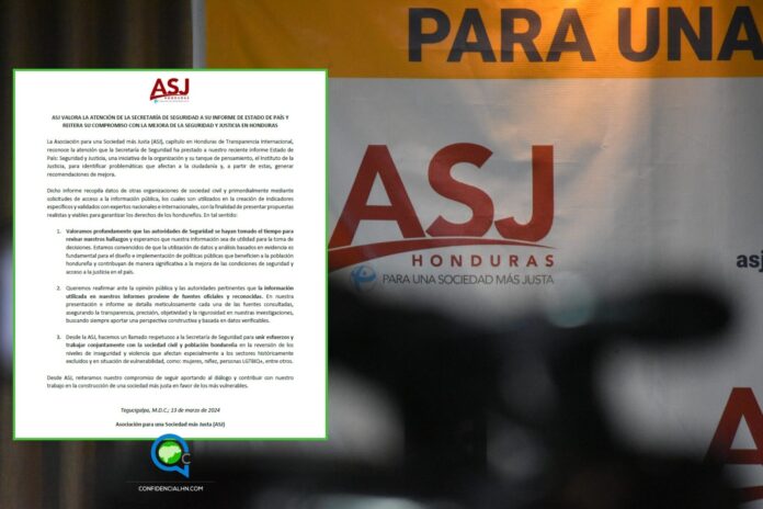 La Asociación para una Sociedad más Justa (ASJ), se pronunció luego de la reacción del titular de la Secretaría de Seguridad, Gustavo Sánchez Velásquez, en torno al informe presentado ayer por ASJ denominado Estado de País 2024, en el cual detallan que, si bien el índice de homicidios ha reducido en un 17%, Honduras sigue siendo el país más violento de Centroamérica.