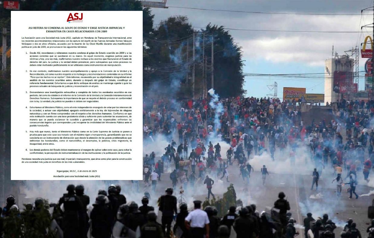 1. Desde ASJ, recordamos y reiteramos nuestra condena al golpe de Estado ocurrido en 2009 y a las acciones violentas que se suscitaron en su marco. En aquel momento, exigimos justicia para las víctimas y hoy, una vez más, reafirmamos nuestro rechazo a los eventos que fracturaron el Estado de derecho del país. La justicia y la verdad deben prevalecer, pero subrayamos que estos procesos no deben estar motivados políticamente ni ser utilizados como instrumentos de manipulación.