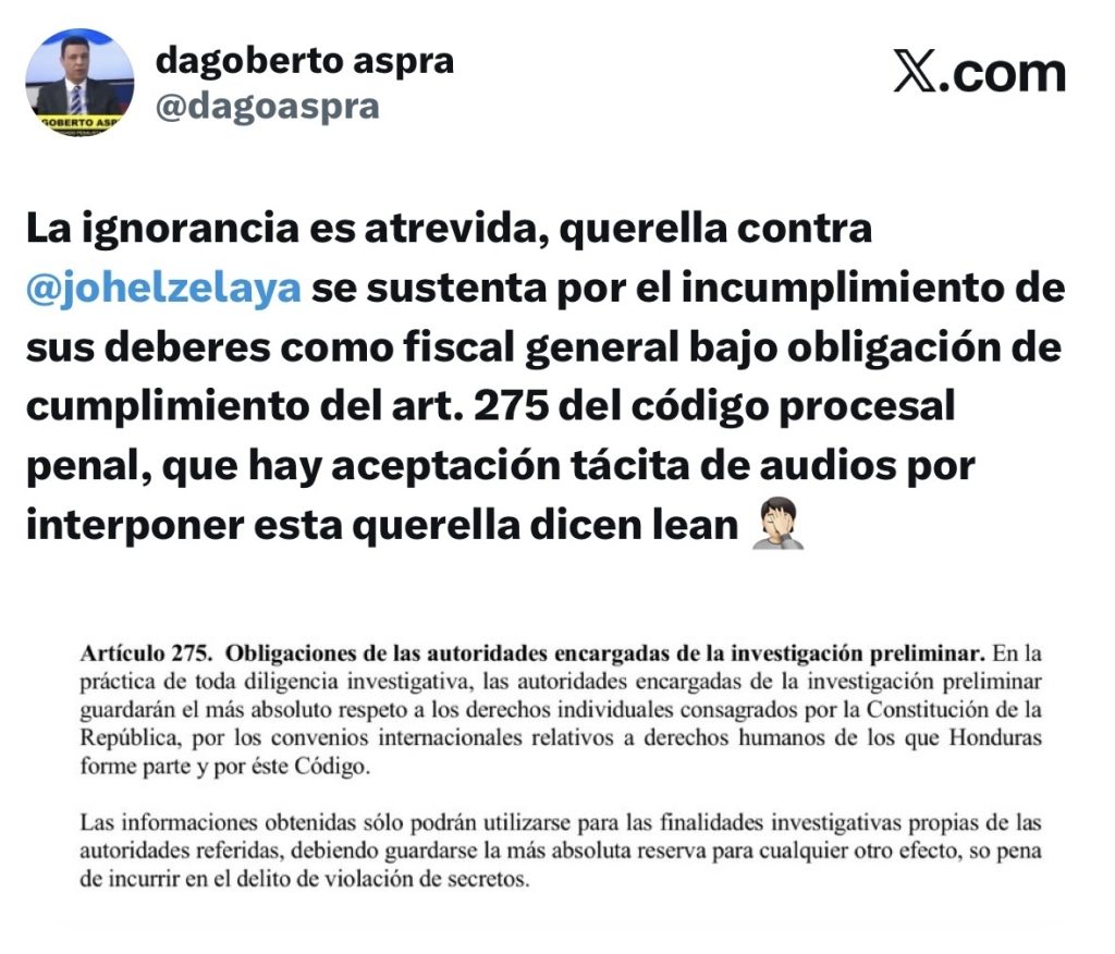 “La ignorancia es atrevida. La querella contra @johelzelaya se sustenta por el incumplimiento de sus deberes como fiscal general bajo obligación de cumplimiento del artículo 275 del Código Procesal Penal. Que hay aceptación tácita de audios por interponer esta querella, dicen… lean”, escribió el abogado.