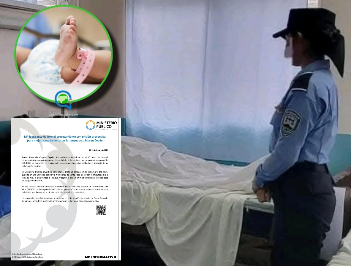 El Ministerio Público investiga este hecho desde el pasado 17 de diciembre del 2024, cuando en una vivienda del barrio Miraflores de Santa Rosa de Copán la imputada dio a luz a su hija, le desprendió la lengua y según el dictamen médico forense, la bebé está en peligro de muerte.