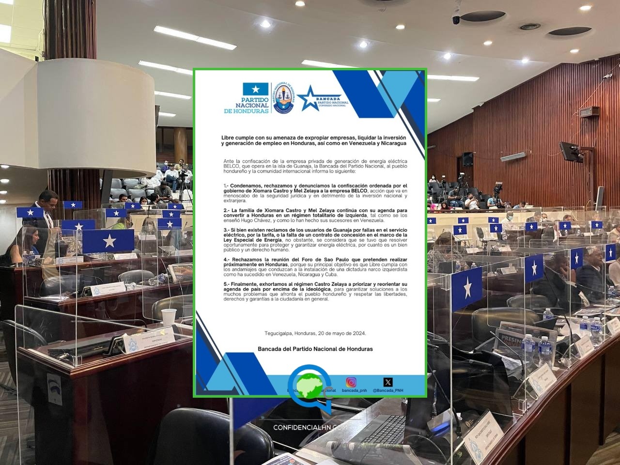 La bancada nacionalista emitió un pronunciamiento en torno a la “intervención” del Gobierno de Honduras a la compañía Belco, encargada del suministro de energía en la isla de Guanaja, Islas de la Bahía.