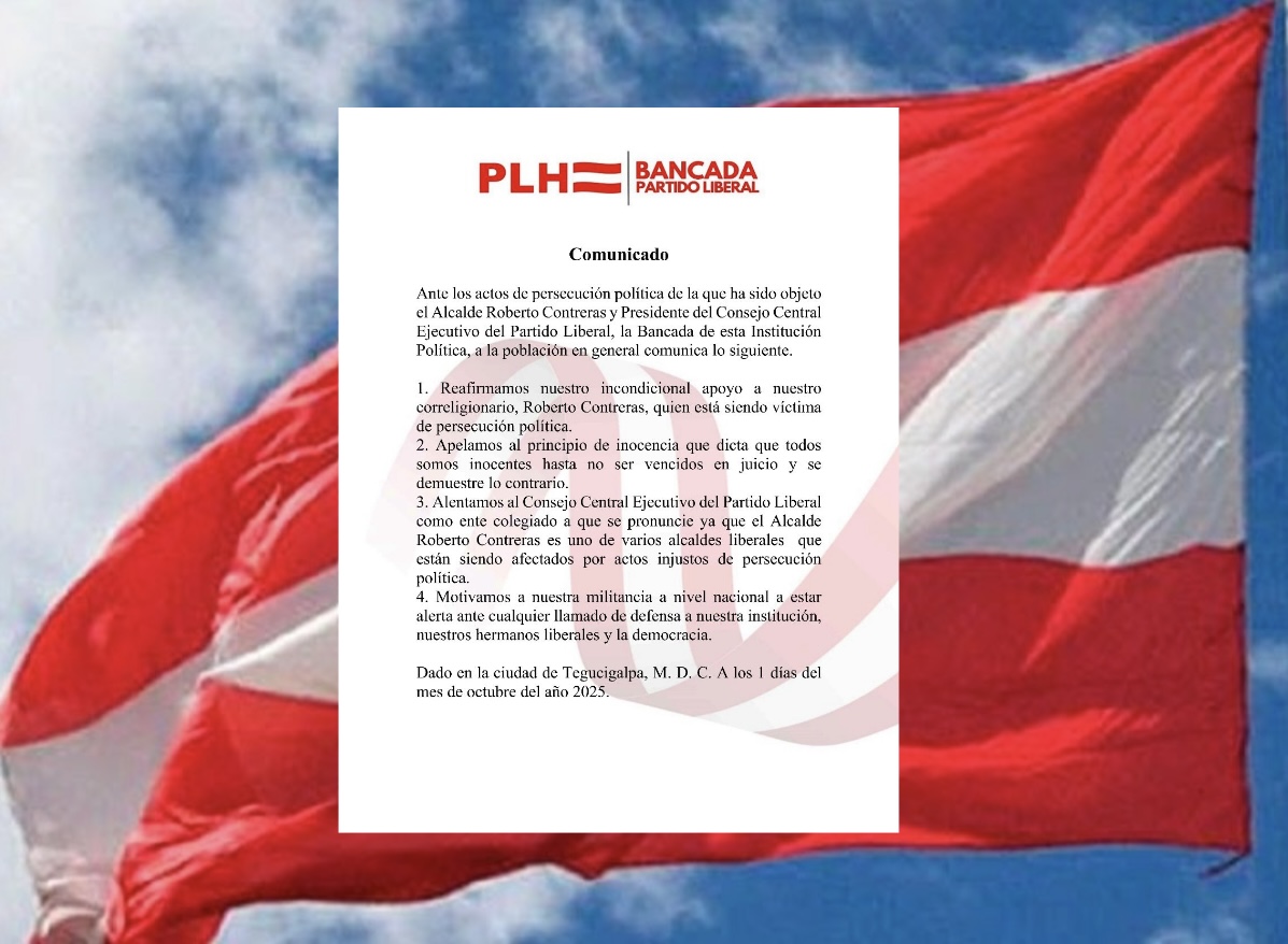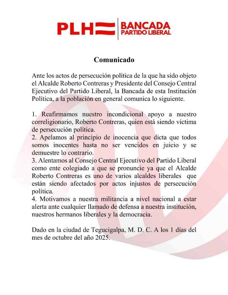 La bancada del Partido Liberal de Honduras (PLH) emitió un contundente comunicado en el que denuncia persecución política contra el alcalde de San Pedro Sula y presidente del Consejo Central Ejecutivo del Partido Liberal (CCEPL), Roberto Contreras, así como contra su familia y personas cercanas.
