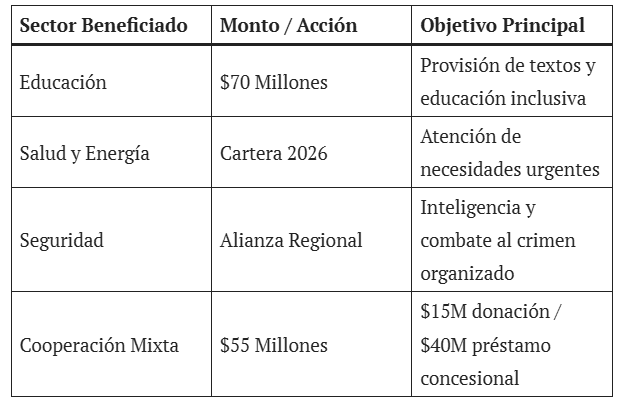 - Los recursos estarán dirigidos a salud, energía, agua, educación y fortalecimiento de las finanzas públicas, mientras el país recibirá misiones técnicas para definir nuevas inversiones.