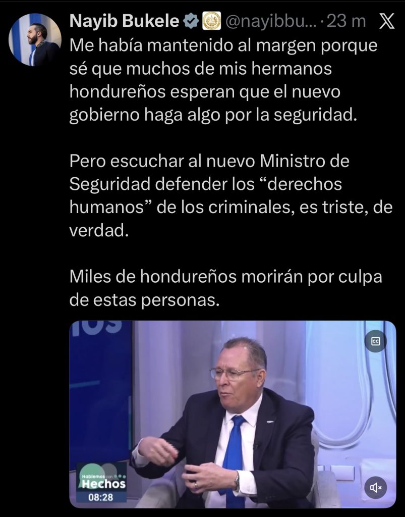 “Me había mantenido al margen porque sé que muchos de mis hermanos hondureños esperan que el nuevo gobierno haga algo por la seguridad. Pero escuchar al nuevo Ministro de Seguridad defender los ‘derechos humanos’ de los criminales, es triste, de verdad. Miles de hondureños morirán por culpa de estas personas”, expresó el mandatario salvadoreño.