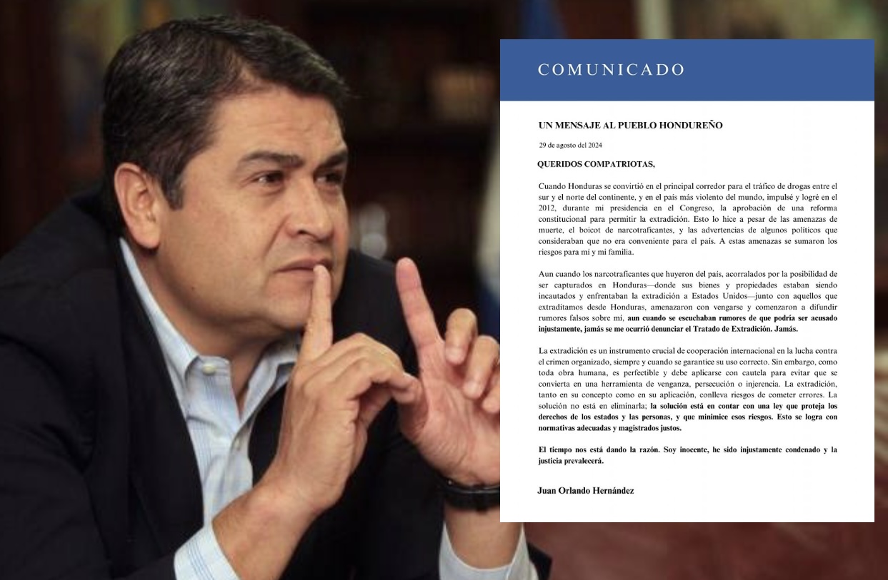El expresidente Juan Orlando Hernández, a través de una carta la cual fue compartida en las redes sociales por su esposa Ana García, se pronunció sobre la denuncia del Tratado de Extradición entre Honduras y EEUU, y aseguró que la solución no es eliminarla.