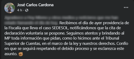 El exministro de Desarrollo Social (Sedesol), José Carlos Cardona, informó este miércoles que el Ministerio Público (MP) decidió posponer la toma de su declaración voluntaria por el caso conocido como el “cheque video”, una investigación que mantiene bajo cuestionamiento al oficialismo por el supuesto uso de fondos públicos con fines políticos.