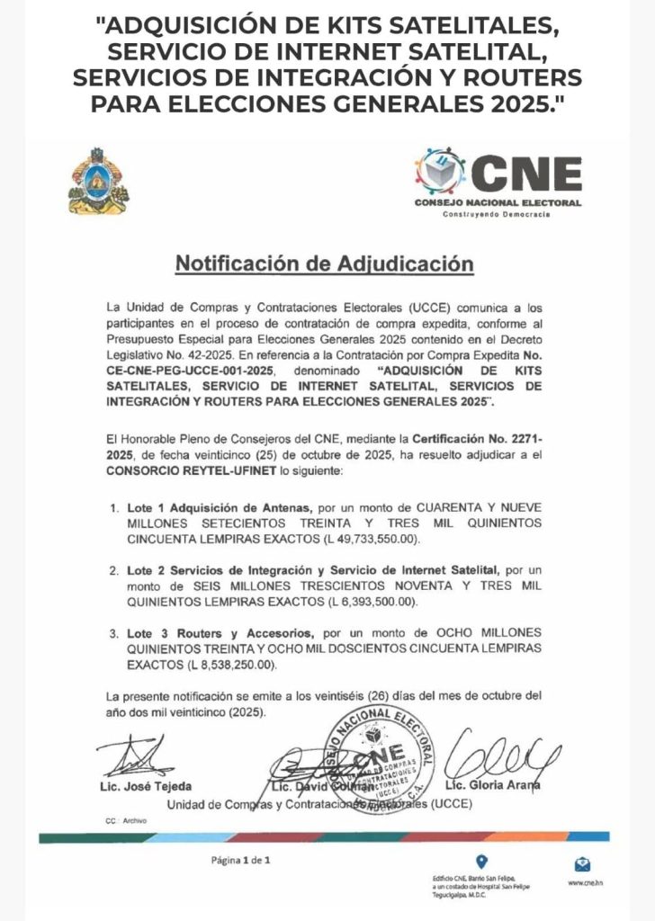 - El Consorcio Reytel-Ufinet será el encargado de proveer antenas, routers y servicio de internet satelital para las Elecciones Generales 2025, por más de 64 millones de lempiras.