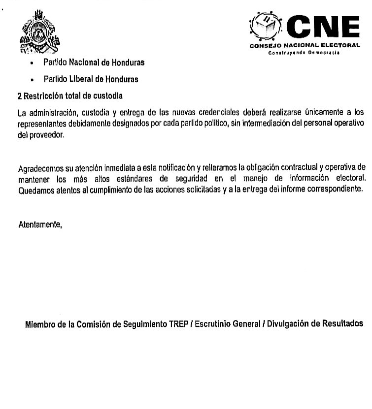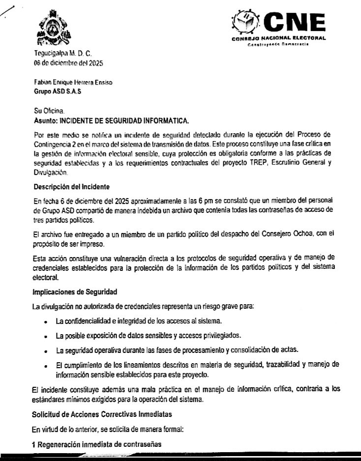 Como medida inmediata, el organismo electoral dispuso la regeneración completa de las contraseñas pertenecientes a los partidos Libre, Nacional y Liberal, y ordenó que las nuevas credenciales se entreguen exclusivamente a los representantes acreditados de cada instituto político.