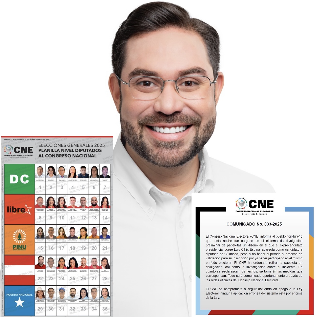 El Consejo Nacional Electoral (CNE) informó este sábado que en el sistema de divulgación preliminar de papeletas se cargó un diseño en el que aparecía el nombre del excandidato presidencial Jorge Luis Cálix Espinal como aspirante a diputado por el departamento de Olancho.