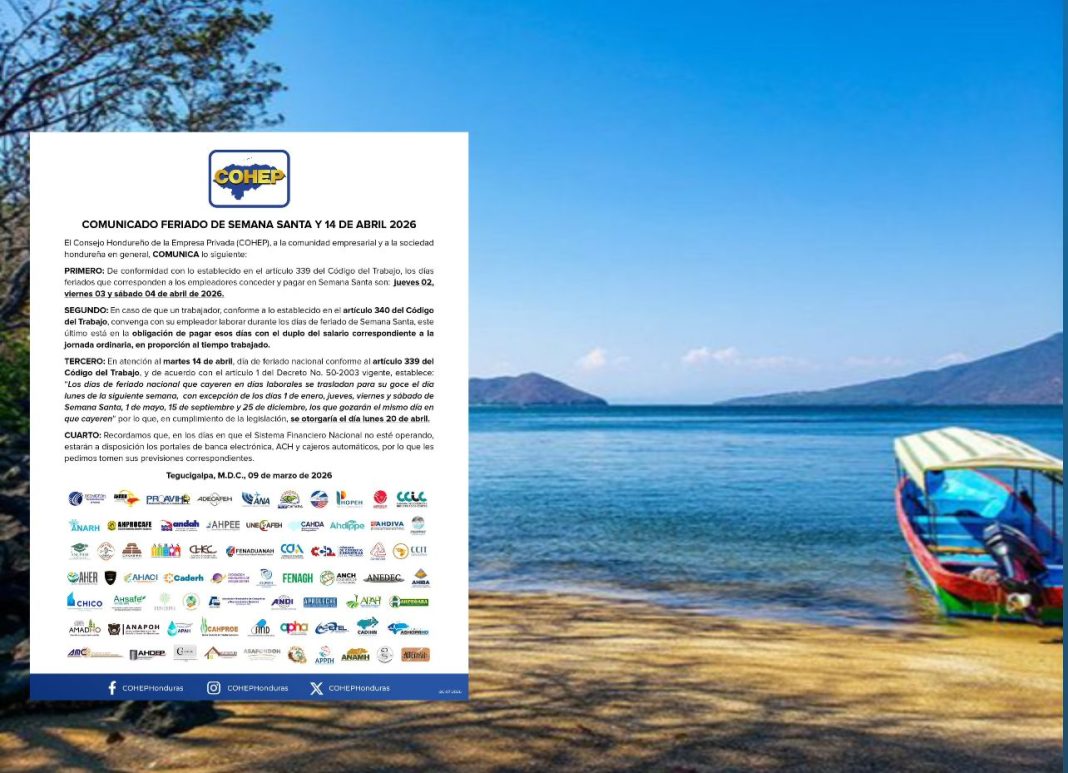 El Consejo Hondureño de la Empresa Privada (Cohep) informó a la comunidad empresarial y a la población en general cuáles serán los feriados oficiales correspondientes a la Semana Santa 2026, así como la aplicación del feriado nacional del 14 de abril, conforme a lo establecido en la legislación laboral hondureña.