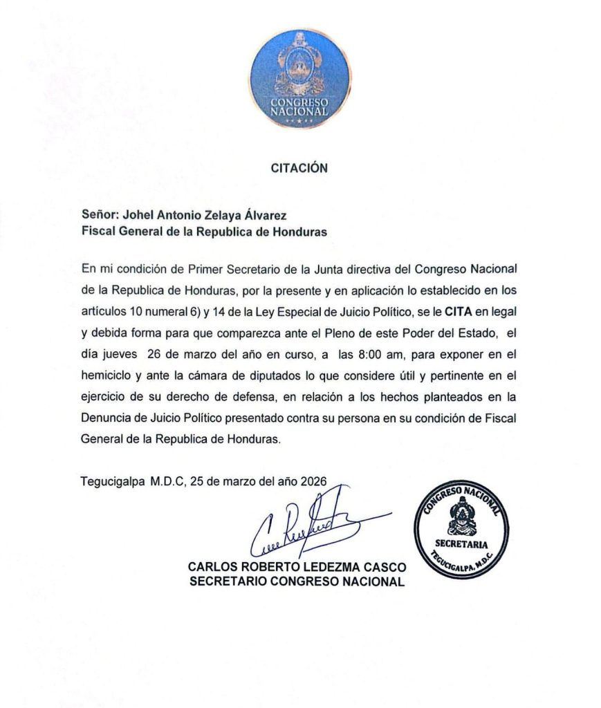 La entrega del informe y la citación de Zelaya al pleno marcan una fase decisiva en el juicio político, en medio de un ambiente de alta tensión política, donde la votación de los diputados podría redefinir el liderazgo del Ministerio Público y profundizar las disputas entre los poderes del Estado.