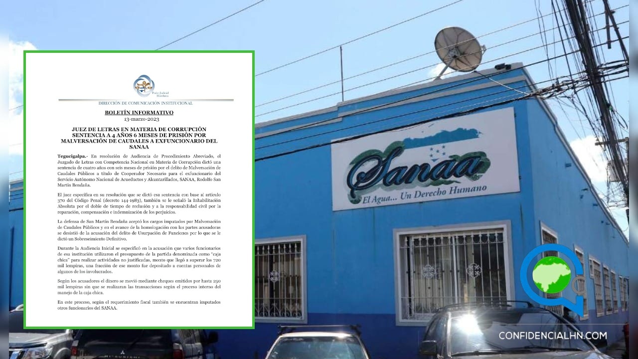 El Juzgado de Letras en Materia de Corrupción dictó este lunes una sentencia de cuatro años con seis meses de prisión a un exfuncionario del Servicio Autónoma Nacional de Acueducto y Alcantarillado (SANAA).