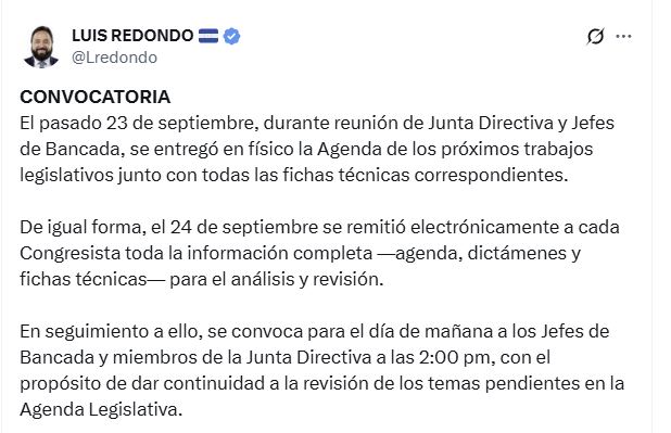 Según informó Redondo en sus redes sociales, el encuentro está programado para este martes a las 2:00 p.m., con el fin de “dar continuidad a la revisión de los temas pendientes en la Agenda Legislativa”.