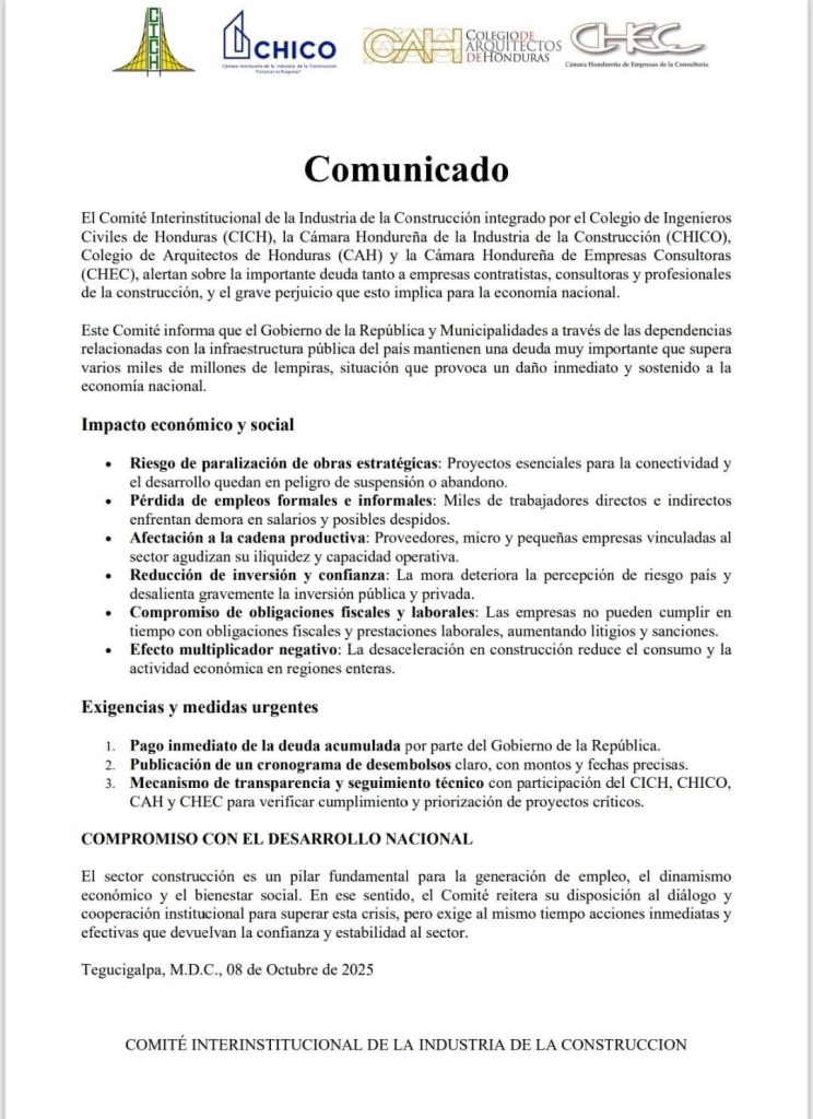 El Comité Interinstitucional de la Cámara Hondureña de la Industria de la Construcción (CHICO) emitió un comunicado en el que advierte que la falta de pago a contratistas, consultores y profesionales del rubro amenaza con paralizar obras, provocar despidos masivos y golpear de manera directa la economía nacional.