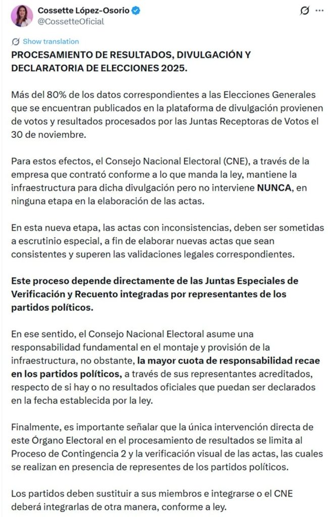 Mediante un pronunciamiento difundido en su cuenta oficial de la red social X, López explicó que más del 80 % de los datos de las Elecciones Generales ya publicados en la plataforma de divulgación provienen de votos y resultados procesados por las Juntas Receptoras de Votos (JRV) el pasado 30 de noviembre.