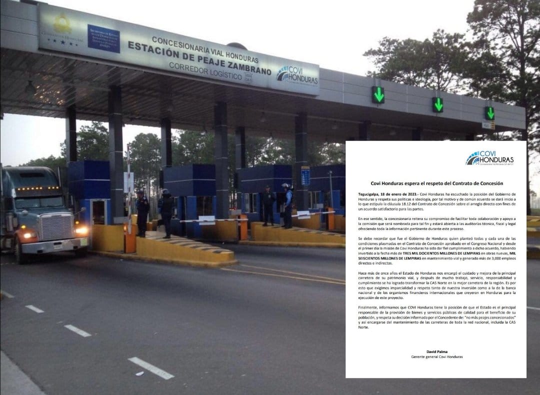 Covi Honduras ha escuchado la posición del Gobierno de Honduras y respeta sus políticas e ideología, por tal motivo y de común acuerdo se dará inicio a lo que estipula la cláusula 18.12 del Contrato de Concesión sobre el arreglo directo con fines de un acuerdo satisfactorio para las partes.