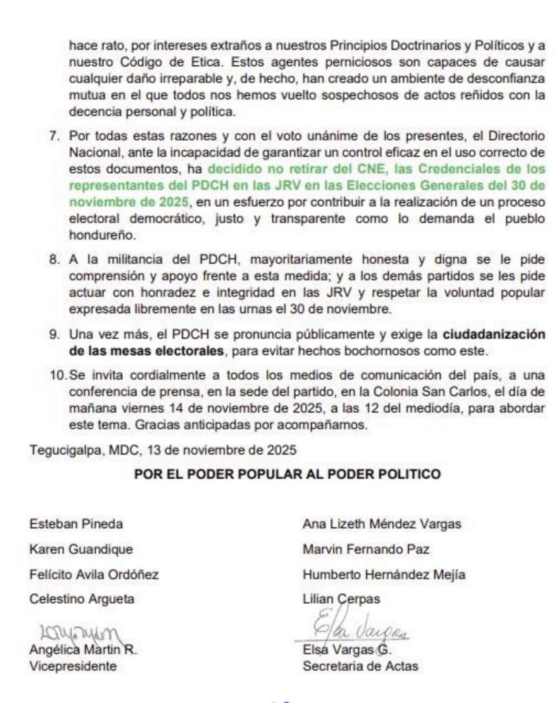 La decisión fue formalizada en un comunicado firmado por Elsa Vargas Gonzáles, Esteban Pineda, Ana Lizeth Méndez Vargas, Angélica Martín, Karen Guandique, Marvin Fernando Paz, Felícito Ávila Ordóñez, Santos Humberto Hernández, Celestino Argueta y Lilian Cerpas. En el documento, los firmantes aseguran haber recibido múltiples advertencias de militantes y presuntos militantes sobre una estructura que estaría comprometiendo las credenciales del partido.