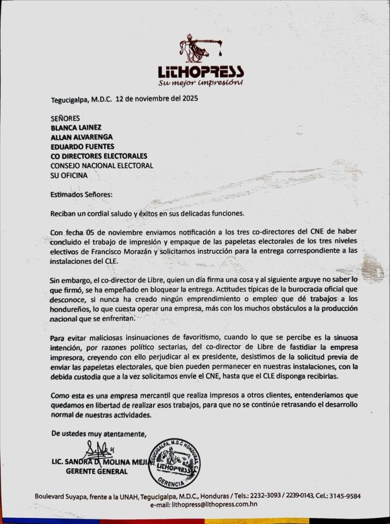 Una nueva controversia sacude al Consejo Nacional Electoral (CNE) a menos de tres semanas de los comicios generales. La empresa LITHOPRESS —encargada de imprimir las papeletas electorales del departamento de Francisco Morazán— denunció un bloqueo político en la entrega del material, señalando directamente al codirector Allan Alvarenga, representante de Libre.