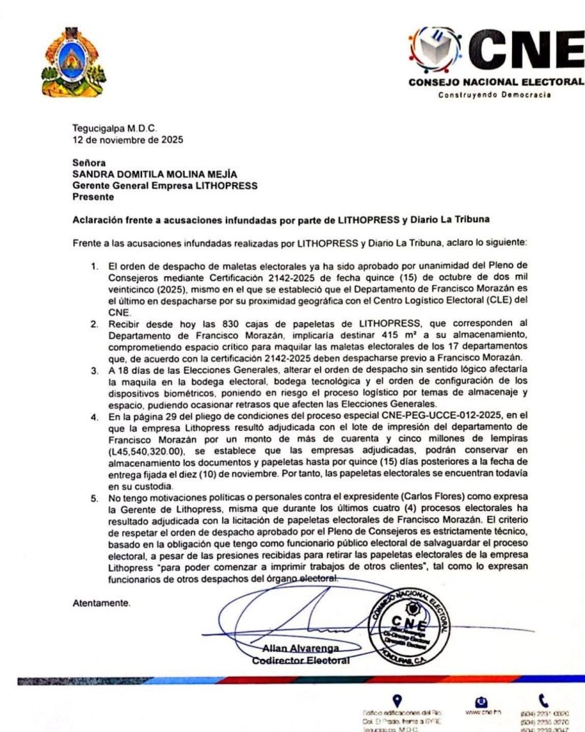 Horas después de la denuncia, el codirector electoral Allan Alvarenga emitió una carta dirigida a la gerente de LITHOPRESS, rechazando las acusaciones y asegurando que el CNE ya había aprobado, por unanimidad, el orden de despacho de las maletas electorales mediante la Certificación 2142-2025.
