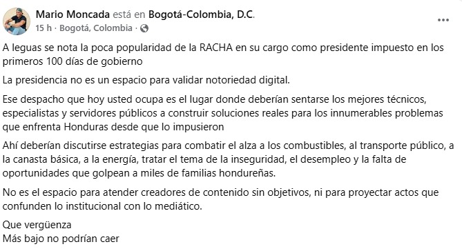 Al parecer Moncada no ha superado la denuncia que en septiembre de 2025 hiciera el creador de contenido en su contra, y por eso discrimina el encuentro entre Nasry Asfura y Lester Cardona más conocido como “Supremo”.