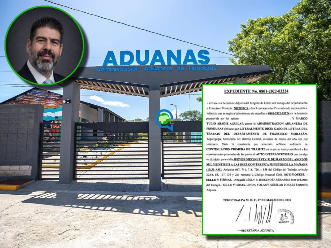 Al titular de Aduanas se le notificó por parte del Juzgado de Letras del Trabajo de Francisco Morazán que el proceso de su demanda laboral continuaba el 19 de marzo de 2026 a las 10:30 de la mañana.