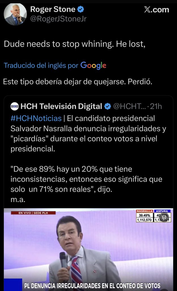 El comentario de Stone llega un día después de que Nasralla afirmara que su equipo técnico ha detectado inconsistencias en aproximadamente el 20% de las actas procesadas, lo que, según él, pone en entredicho la legitimidad de los resultados preliminares.