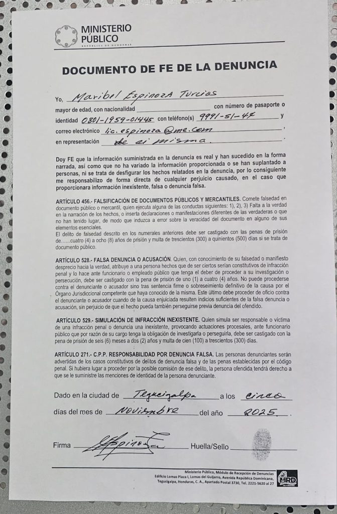 “Lo que él está haciendo en el Congreso Nacional es autoritarismo, está poniendo en una grave crisis al Estado de Honduras. Estos hechos son los que he venido a denunciar”, manifestó Espinoza, quien aseguró que la primera denuncia presentada no ha tenido ningún avance ni citatorio, reflejando la falta de acción de las autoridades competentes.