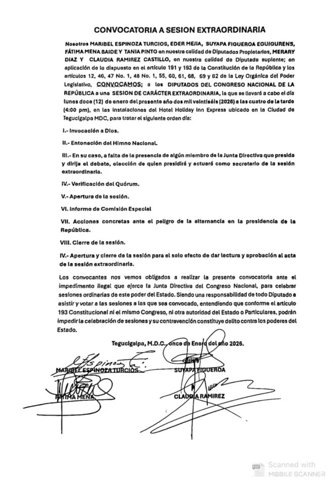 La convocatoria, firmada por los diputados Maribel Espinoza, Eder Mejía, Suyapa Figueroa, Fátima Mena, Tania Pinto, Merary Díaz y Claudia Ramírez, establece que la sesión se realizará a partir de las 4:00 de la tarde en un hotel capitalino, amparados en los artículos 191 y 193 de la Constitución de la República y en diversas disposiciones de la Ley Orgánica del Poder Legislativo.