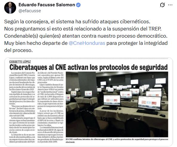 Las declaraciones de Facussé se suman a las de varios sectores que han manifestado preocupación por la seguridad del sistema electoral, especialmente tras la interrupción del TREP, el estrecho margen entre los candidatos y el contexto de tensión política.