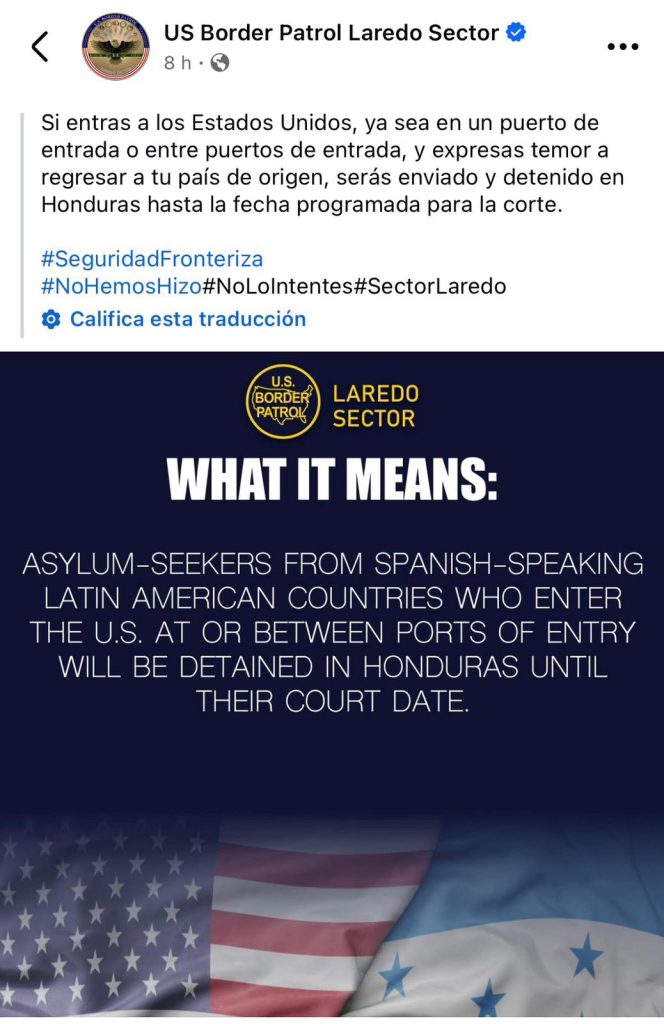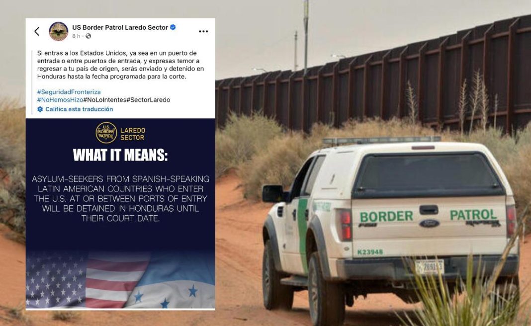 La Patrulla Fronteriza del Sector Laredo, en Estados Unidos, informó en sus redes sociales que los solicitantes de asilo provenientes de países latinoamericanos que entren a territorio estadounidense podrán ser enviados y detenidos en Honduras mientras esperan la fecha de su audiencia ante la corte migratoria.