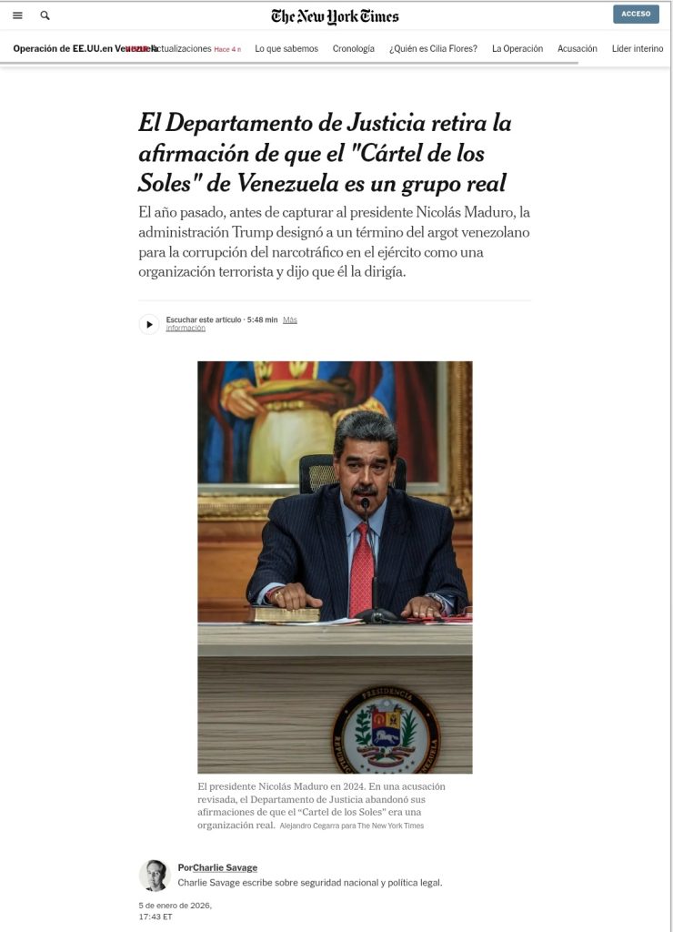 De acuerdo con un artículo publicado por The New York Times, el Departamento de Justicia de Estados Unidos retiró la afirmación de que Maduro lideraba un supuesto cártel de drogas conocido como el “Cártel de los Soles”.