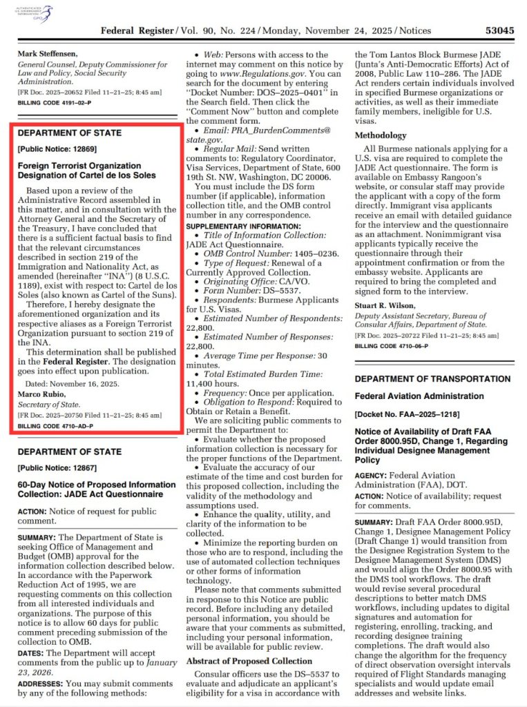 El Departamento de Estado de Estados Unidospublicó en el Registro Federal la designación oficial del Cartel de los Soles como Organización Terrorista Extranjera (FTO), en virtud de la sección 219 de la Ley de Inmigración y Nacionalidad (INA). La medida, firmada por el secretario de Estado Marco Rubio, entra en vigor de manera inmediata tras su publicación.