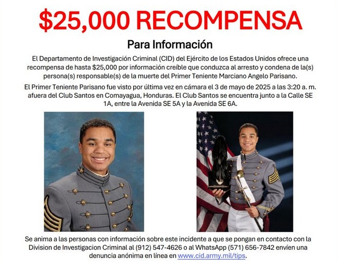 El Departamento del Ejército de Estados Unidos anunció este lunes que ha aumentado a 25 mil dólares la recompensa por información que lleve a la identificación y captura de los responsables de la muerte del militar Ángelo Marciano Parisano, encontrado sin vida el 3 de mayo de 2025 en la base militar conjunta Enrique Soto Cano, ubicada en Palmerola, Comayagua.