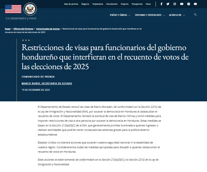 El Gobierno de Estados Unidos, a través del Departamento de Estado de Estados Unidos, anunció la revocatoria y negación de visas a dos funcionarios hondureños vinculados al proceso electoral, al considerar que socavaron la democracia en Honduras al impedir el desarrollo normal del escrutinio de votos.