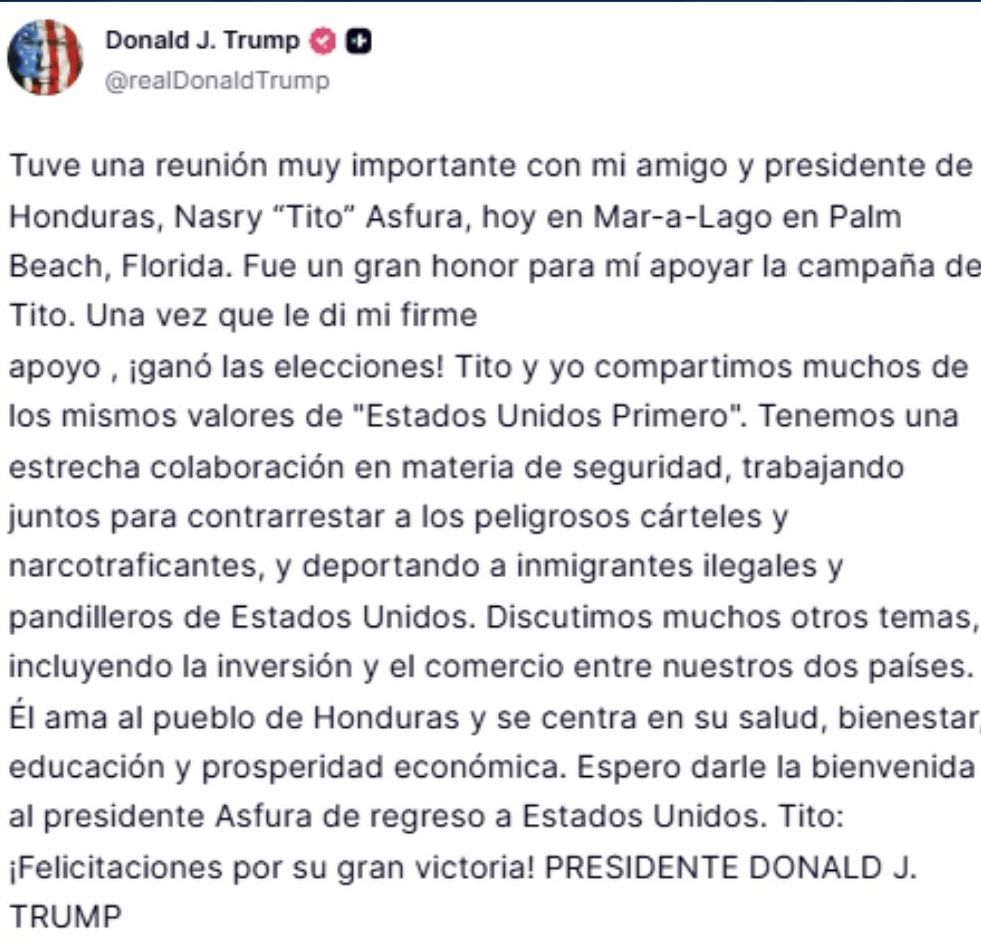 A través de su red social “Truth Social”, el presidente de Estados Unidos, Donald Trump, expuso los avances de la reunión que sostuvo con el presidente de Honduras, Nasry Asfura, realizada en Mar-a-Lago, en Palm Beach, Florida.