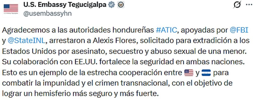 La Embajada de Estados Unidos en Honduras destacó la captura del hondureño Alexis Flores, quien es solicitado en extradición por las autoridades estadounidenses por los delitos de asesinato, secuestro y abuso sexual de una menor, en un operativo realizado con la cooperación de instituciones de ambos países.