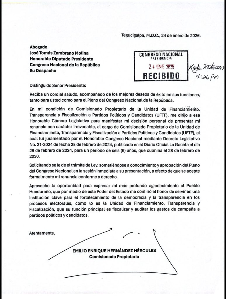 En las últimas horas, Emilio Hernández Hércules, remitió su renuncia como comisionado propietario de la Unidad de Financiamiento, Transparencia y Fiscalización a Partidos Políticos y Candidatos (UFTF), al Congreso Nacional (CN), para ejercer funciones en la Secretaría de Finanzas.