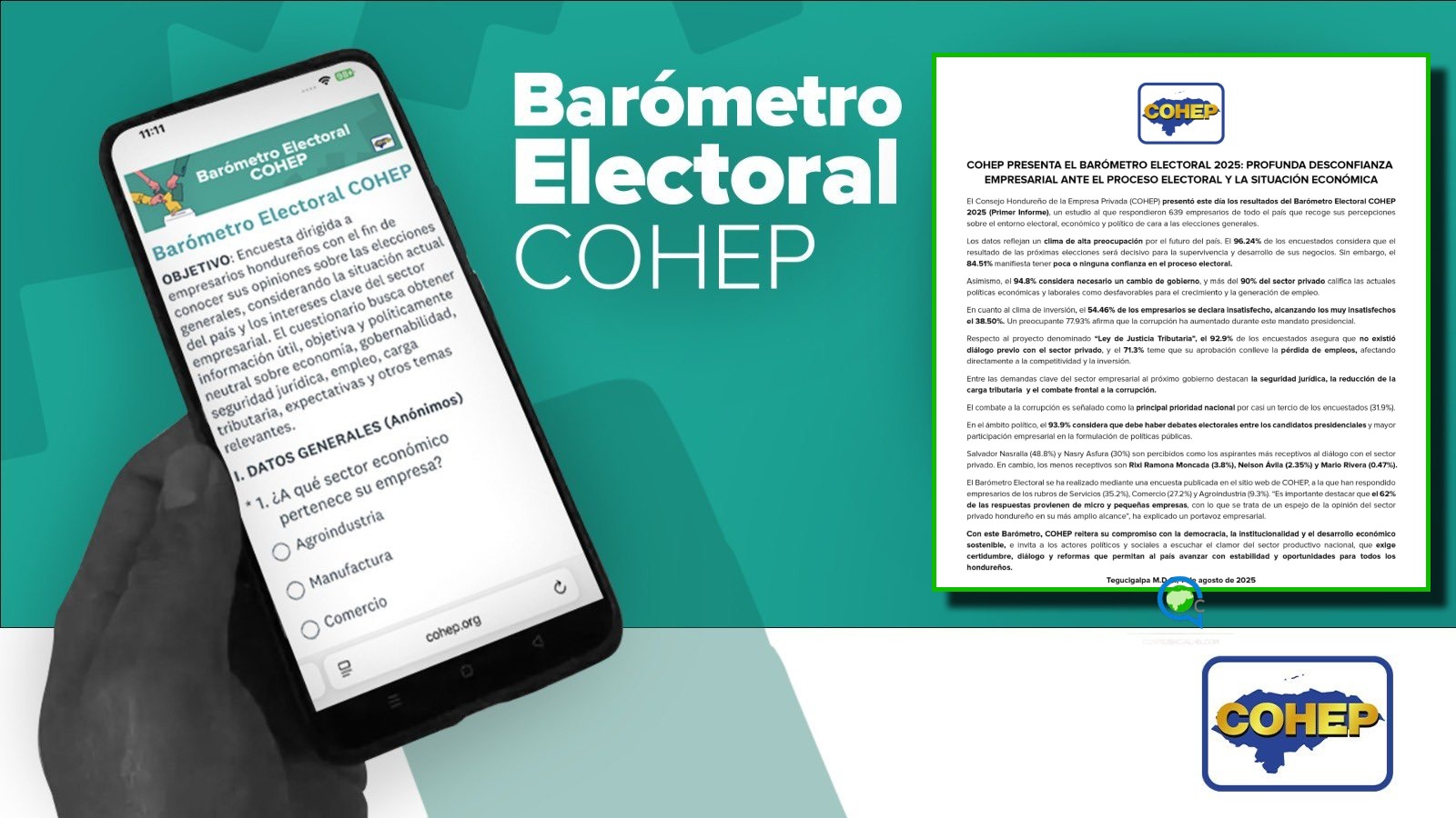 El Consejo Hondureño de la Empresa Privada (COHEP) presentó este jueves los resultados del Barómetro Electoral 2025, un estudio que evidencia la creciente desconfianza del sector empresarial ante el rumbo del país en el marco de las próximas elecciones generales.