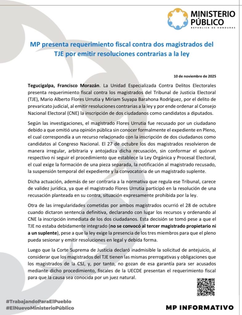 En un hecho que sacude el ambiente político y jurídico del país, el Ministerio Público (MP) presentó un requerimiento fiscal contra los magistrados del Tribunal de Justicia Electoral (TJE), Mario Alberto Flores Urrutia y Miriam Suyapa Barahona Rodríguez, a quienes acusa de emitir resoluciones contrarias a la ley y ordenar al Consejo Nacional Electoral (CNE) la inscripción de ciudadanos como candidatos a diputados, sin cumplir los procedimientos legales establecidos.