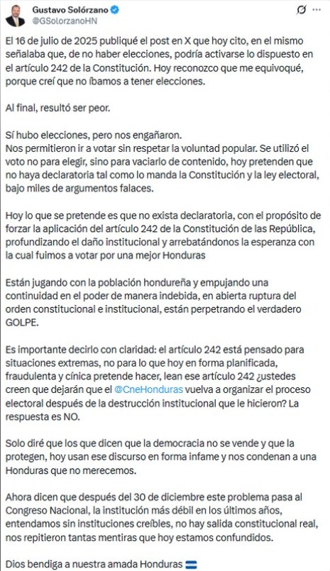 “Hoy lo que se pretende es que no exista declaratoria, con el propósito de forzar la aplicación del artículo 242, profundizando el daño institucional y arrebatándonos la esperanza con la cual fuimos a votar por una mejor Honduras”, manifestó.