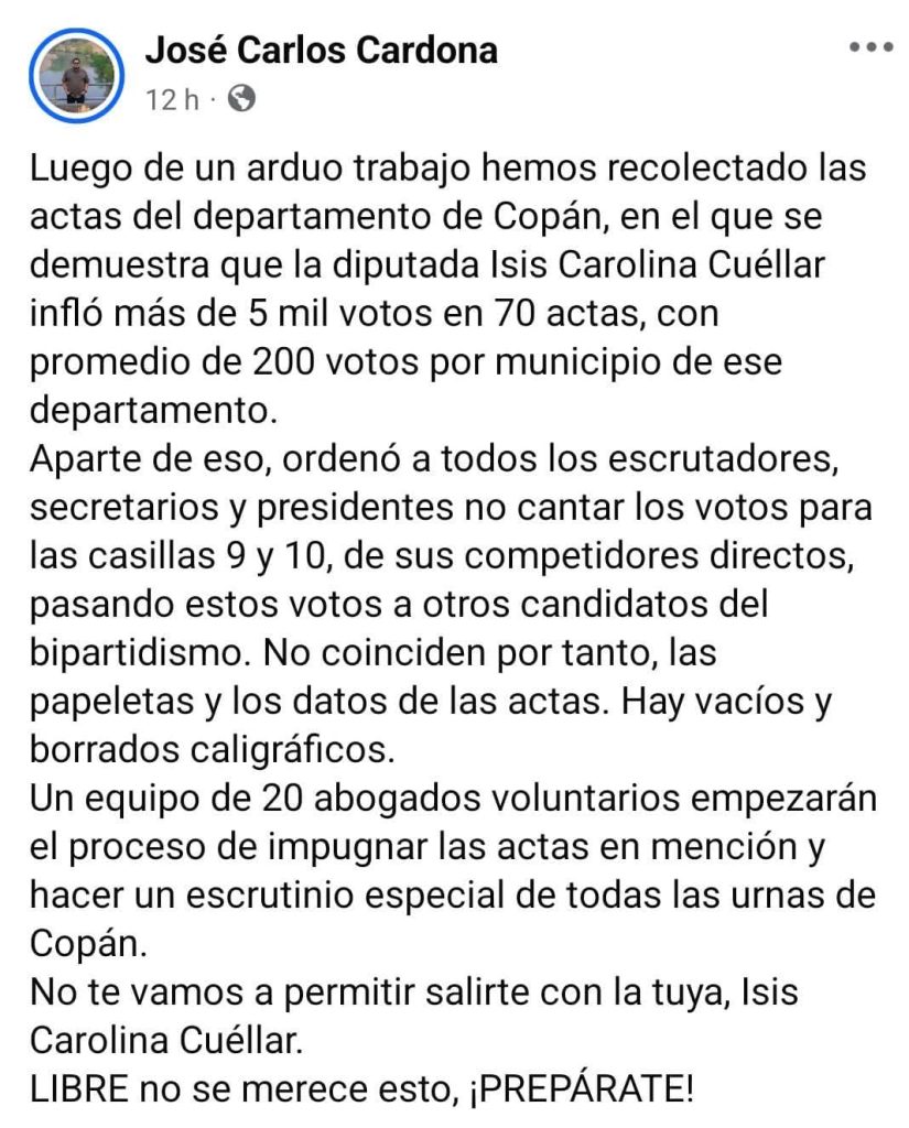 “Luego de un arduo trabajo hemos recolectado las actas del departamento de Copán, en el que se demuestra que la diputada Isis Carolina Cuéllar infló más de 5 mil votos en 70 actas, con promedio de 200 votos por municipio de ese departamento”, escribió el exfuncionario.