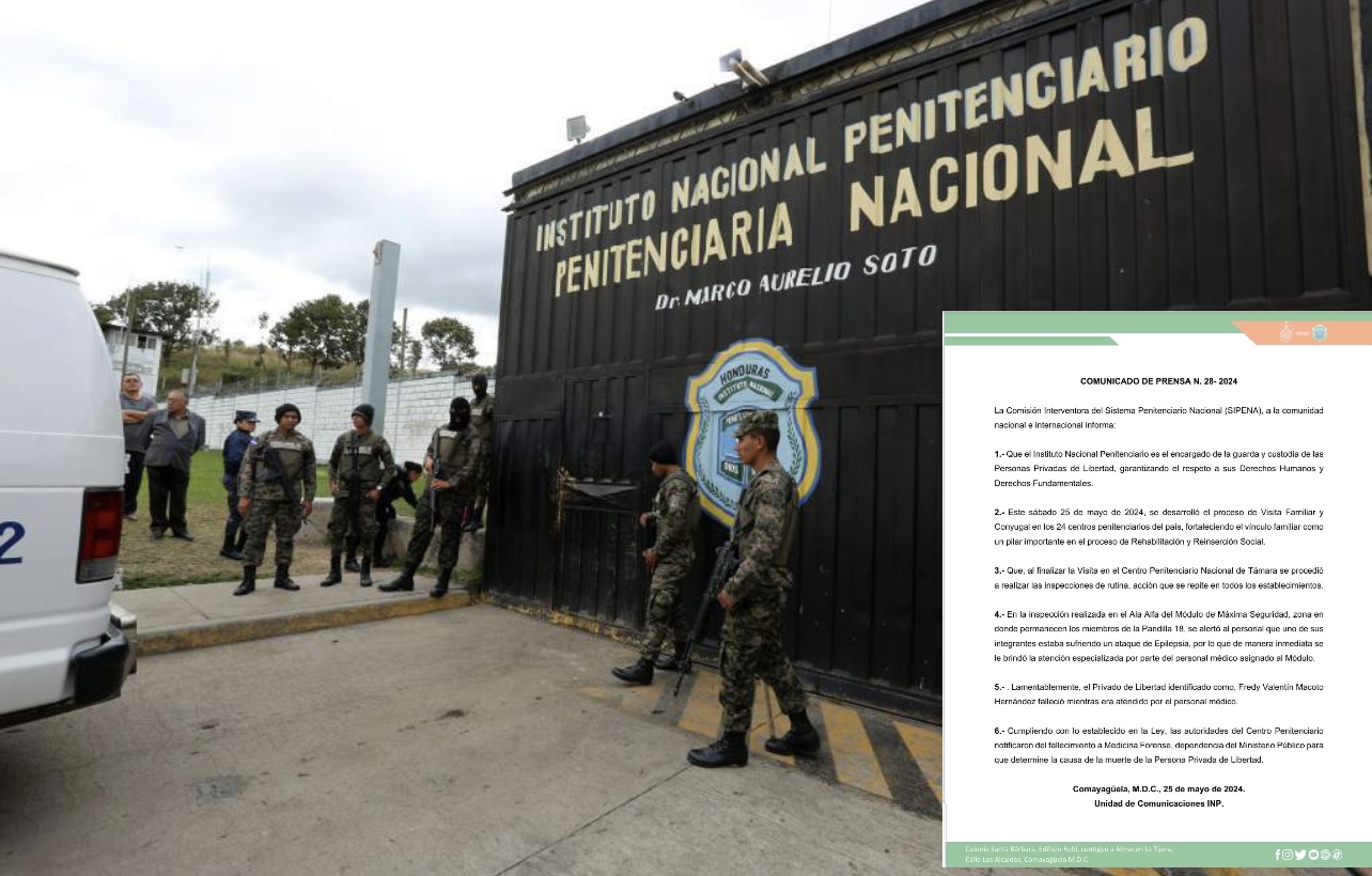 La Comisión Interventora del Sistema Penitenciario Nacional (SIPENA), dio a conocer mediante comunicado sobre el fallecimineto de un privado de libertad en la cárcel de Támara, Francisco Morazán.