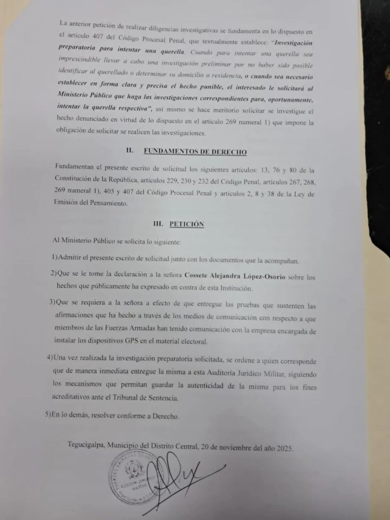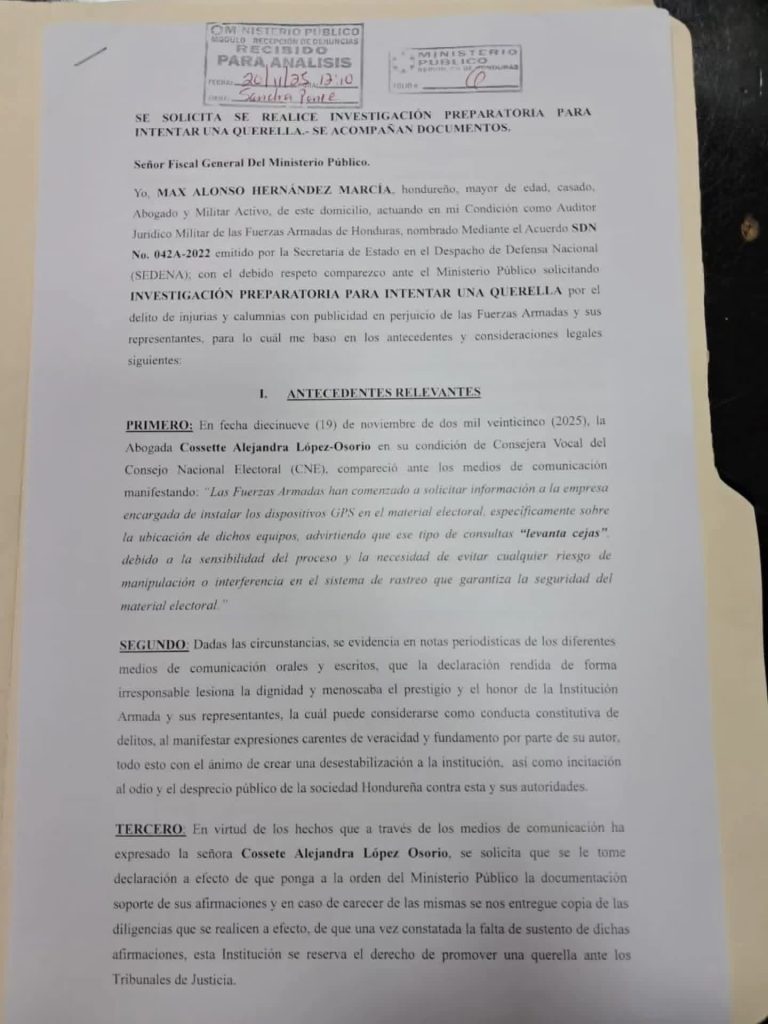 Las Fuerzas Armadas de Honduras (FF.AA.) presentaron este jueves ante el Ministerio Público (MP) una solicitud preparatoria con el fin de interponer una querella por los delitos de injurias y calumnias contra la consejera del Consejo Nacional Electoral (CNE), Cossette López-Osorio.